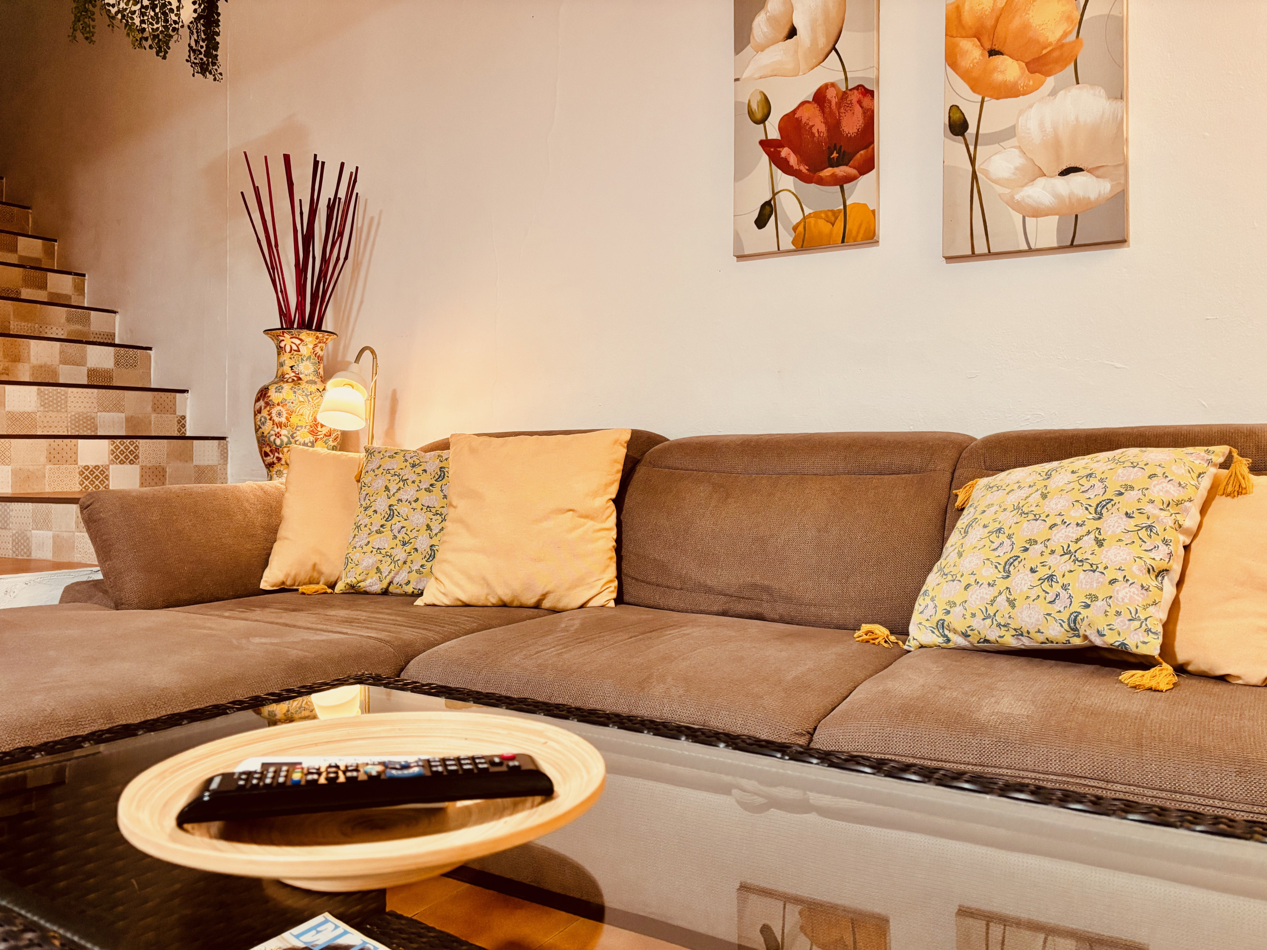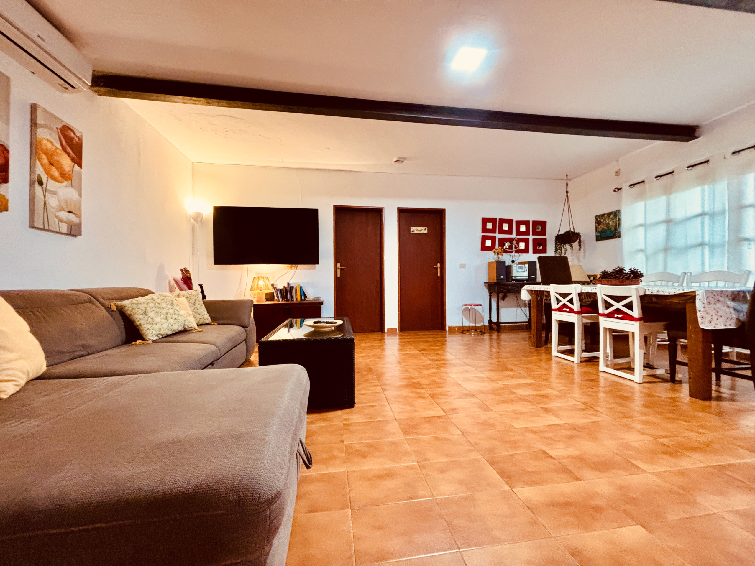 Innen finden Sie alles, was Sie brauchen: Wohnzimmer mit Sofa, 65" Smart-TV mit Apps wie Samsung TV Plus und YouTube, Highspeed-Internet (600 Mb/s, WLAN und Kabel), Klimaanlage/Heizung in Wohnzimmer und Schlafzimmern, Hi-Fi-Anlage und Brettspiele. Die Küche ist komplett ausgestattet mit Backofen-Mikrowelle, Cerankochfeld und kleinen Geräten (Saftpresse, Mixer, Toaster, Wasserkocher) sowie einem Essbereich für 6 Personen.
