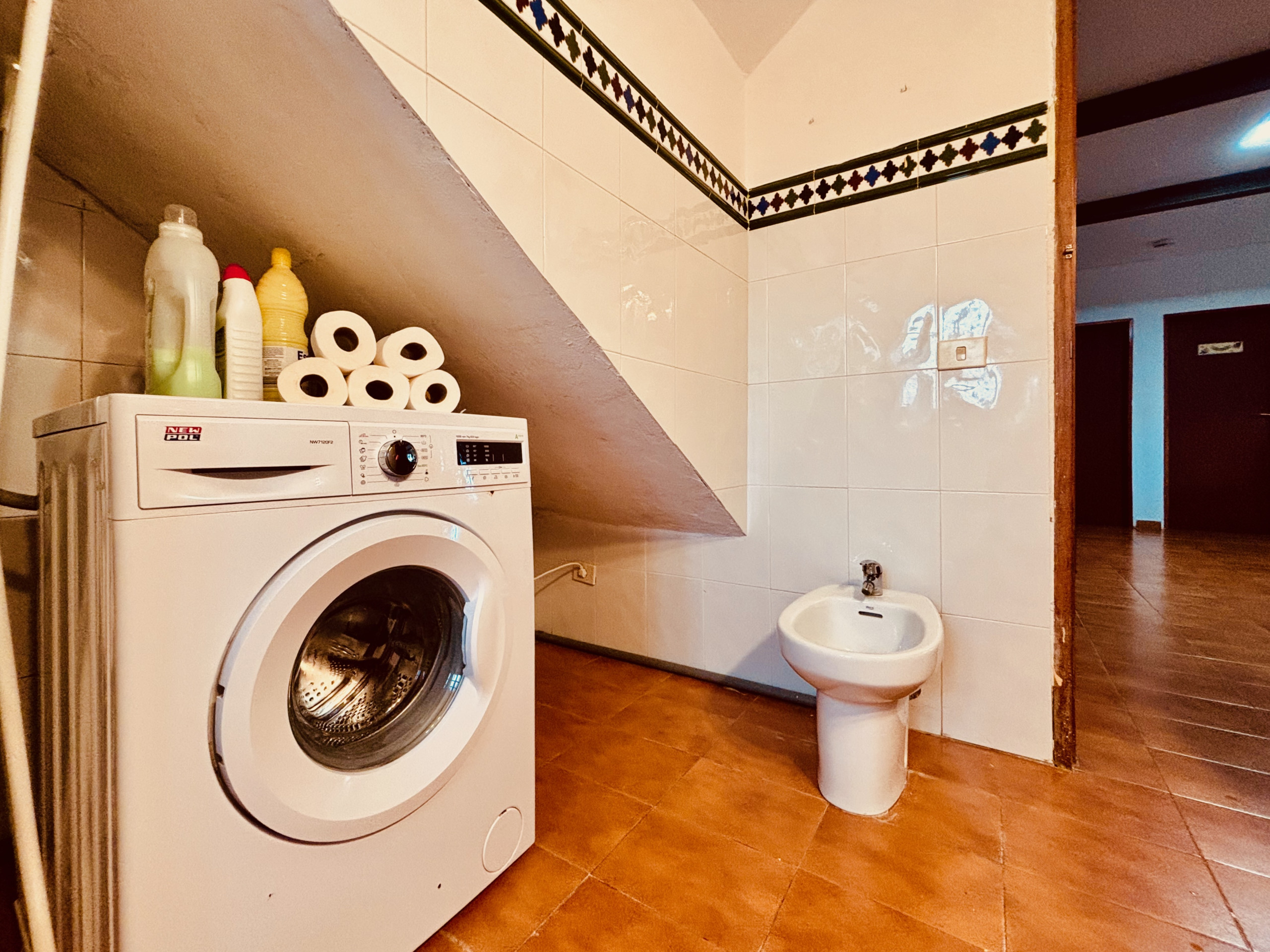 Das Haus bietet 2 Schlafzimmer: eines mit Doppelbett und eines mit drei Einzelbetten, alle mit hochwertigen Matratzen und individueller Klimaanlage. Das Badezimmer ist mit Badewanne, Bidet und WC ausgestattet. Über die Innentreppe erreichen Sie die Dachterrasse – perfekt zum Sonnenbaden oder um die Aussicht zu genießen. Bettwäsche, Handtücher, Pflegeprodukte, Waschmaschine, Trockner und Bügeleisen sind inklusive.